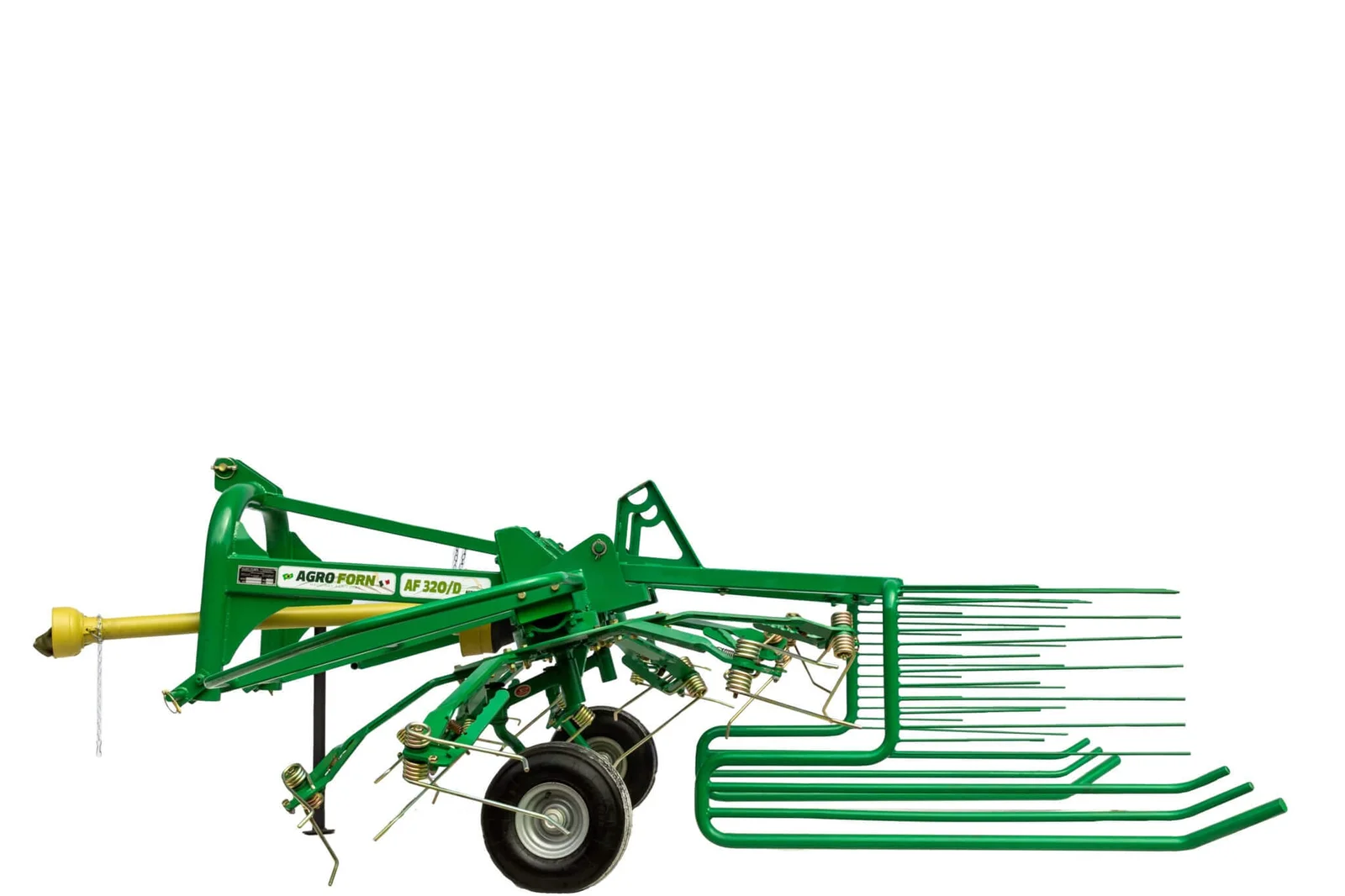O ancinho duplo AFD 320/D da Agroforn, de fabricação nacional, permite enleirar com a qualidade de um trabalho manual, proporcionando forragem limpa, sem pedras e terra.